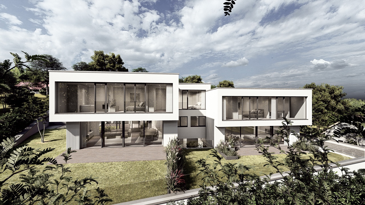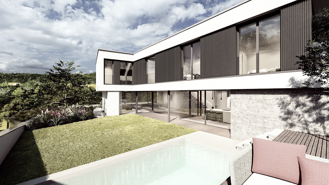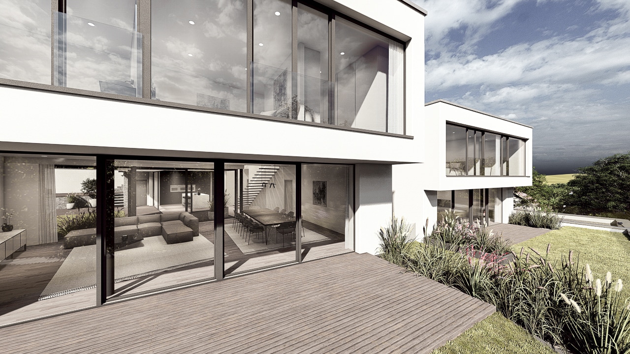 Das Doppelhaus B besticht durch seine moderne, elegante Architektur mit klaren Linien und großzügigen Glasflächen. Bei diesem Projekt war die Herausforderung die natürliche Hanglage aufzunehmen und die Baukörper in die angrenzende Umgebung einzufügen. Die versetzte Kubatur schafft spannende Perspektiven und sorgt für eine harmonische Gliederung der Baukörper. Offen gestaltete Wohnräume mit direktem Zugang zum Garten und Poolbereich bieten höchsten Wohnkomfort. Die hochwertige Materialwahl und das durchdachte Lichtkonzept unterstreichen den zeitgemäßen Charakter des Gebäudes.