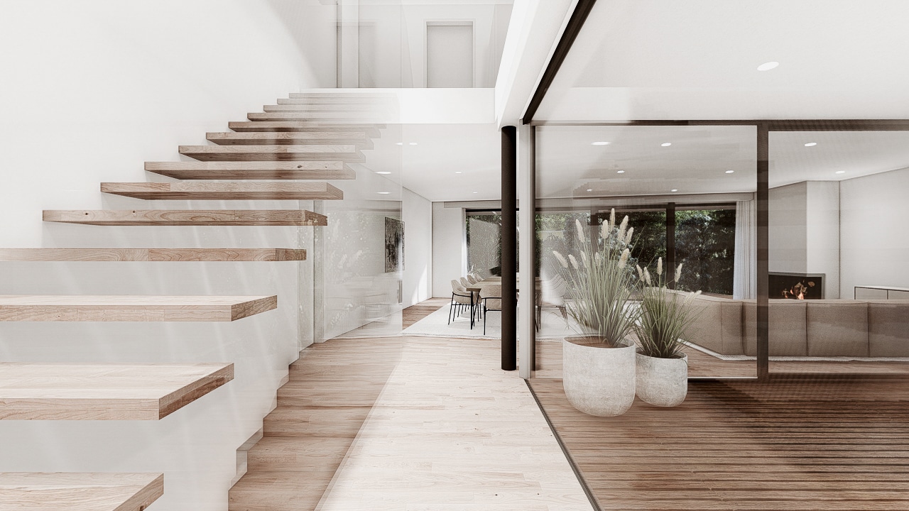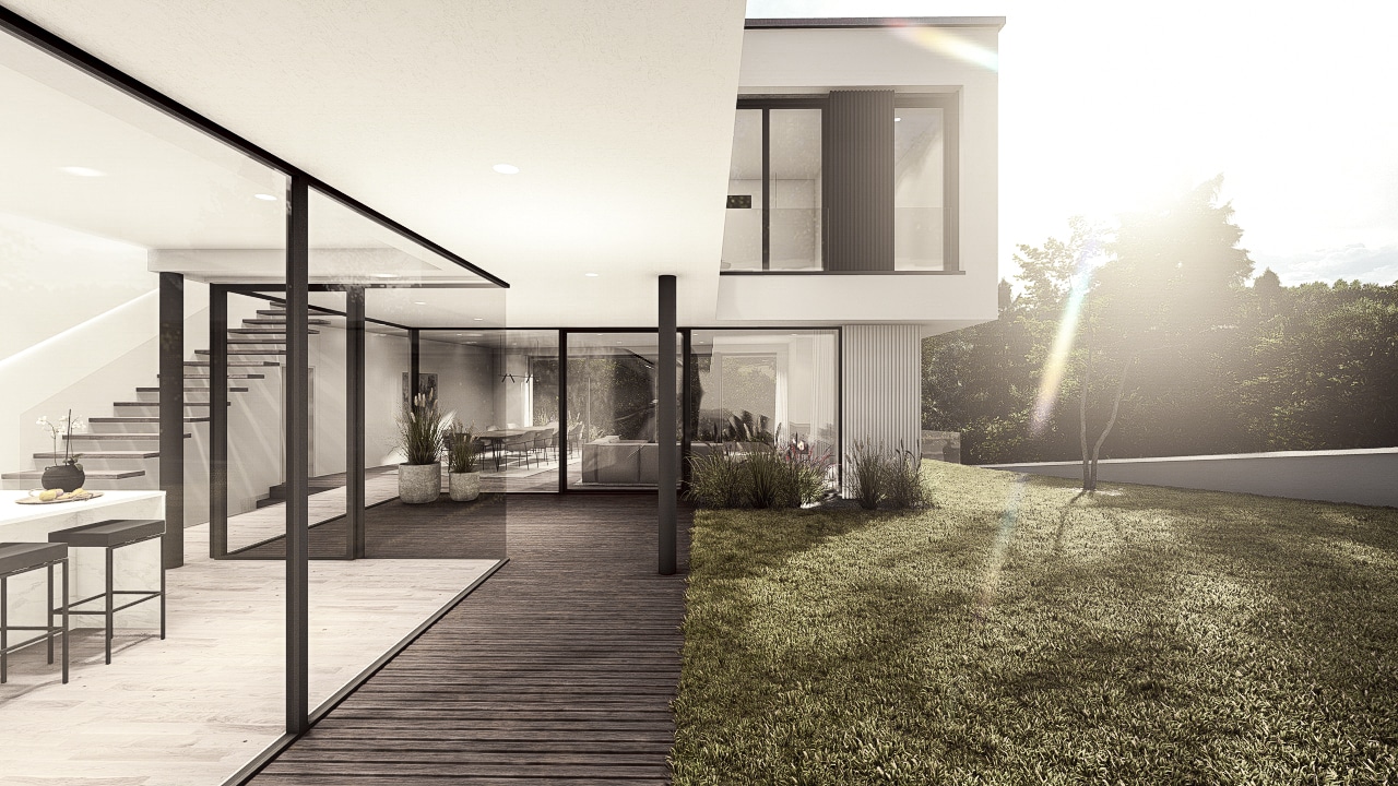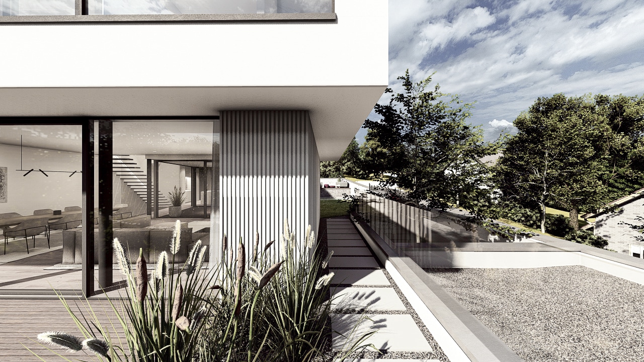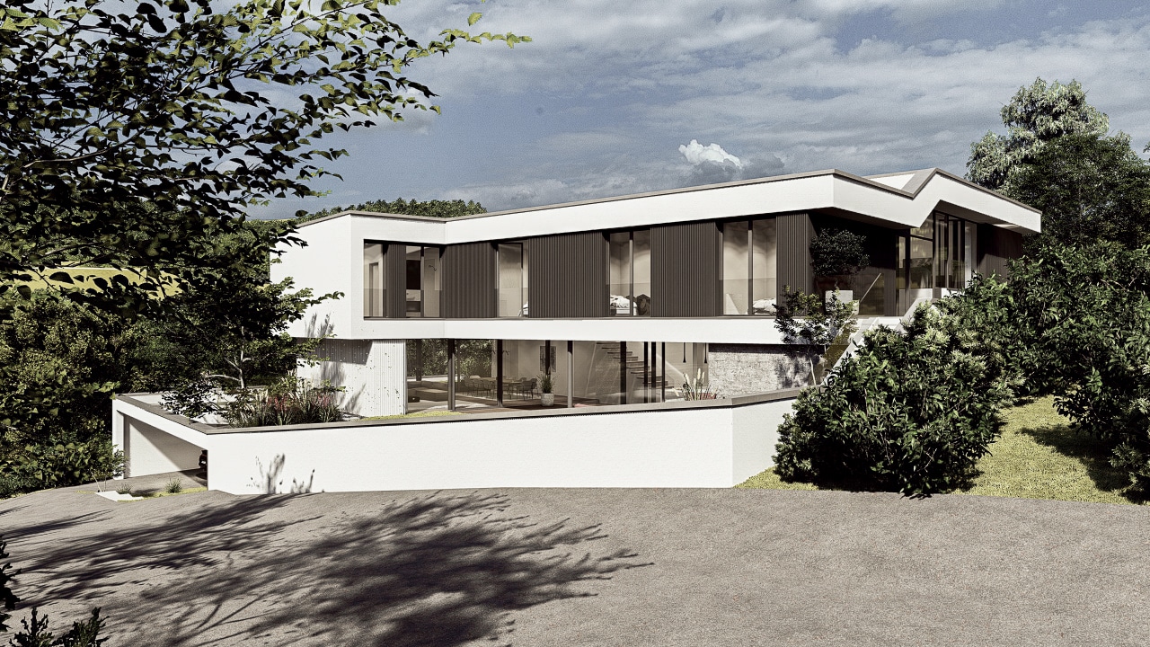 Das Doppelhaus B besticht durch seine moderne, elegante Architektur mit klaren Linien und großzügigen Glasflächen. Bei diesem Projekt war die Herausforderung die natürliche Hanglage aufzunehmen und die Baukörper in die angrenzende Umgebung einzufügen. Die versetzte Kubatur schafft spannende Perspektiven und sorgt für eine harmonische Gliederung der Baukörper. Offen gestaltete Wohnräume mit direktem Zugang zum Garten und Poolbereich bieten höchsten Wohnkomfort. Die hochwertige Materialwahl und das durchdachte Lichtkonzept unterstreichen den zeitgemäßen Charakter des Gebäudes.
