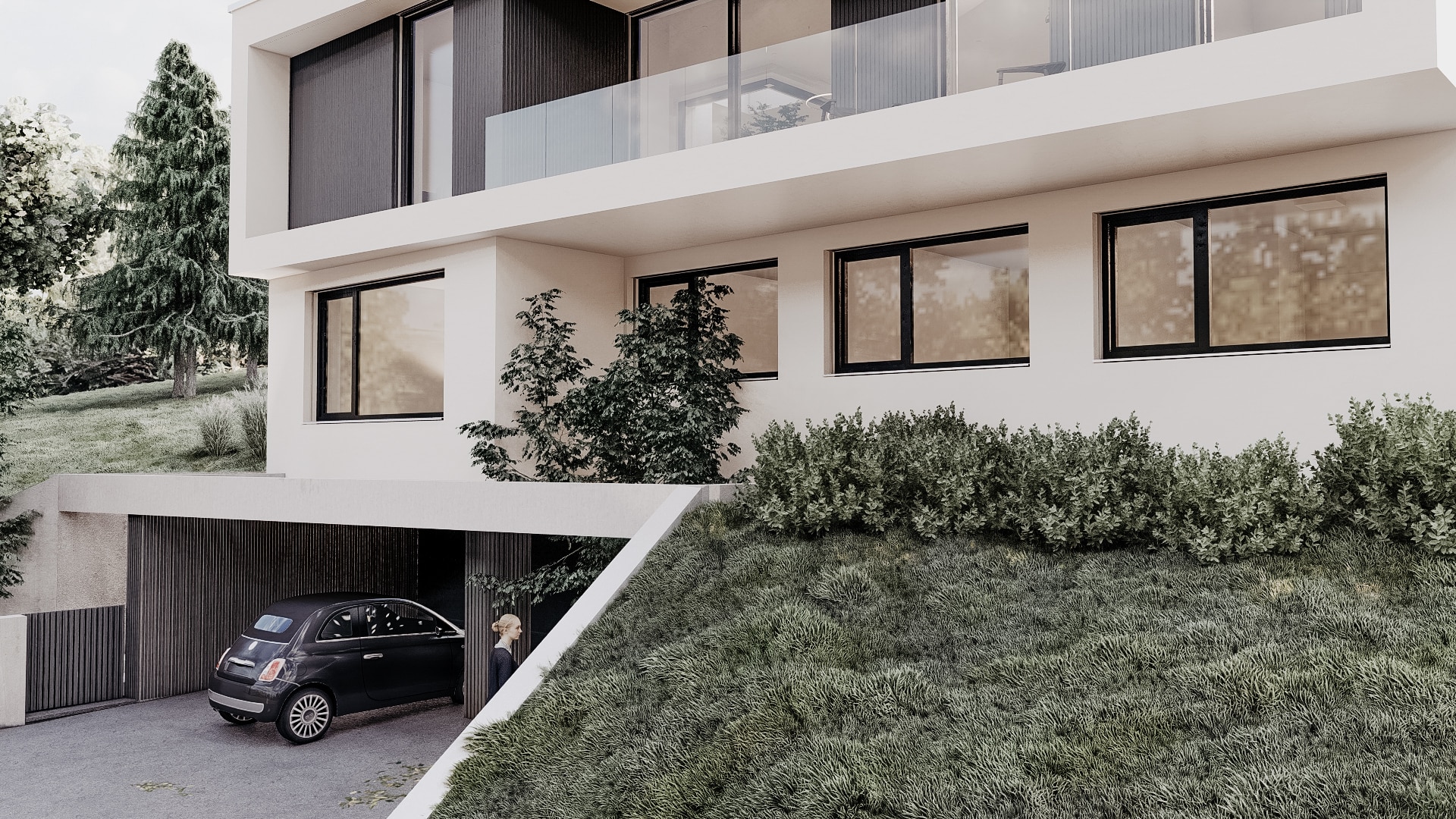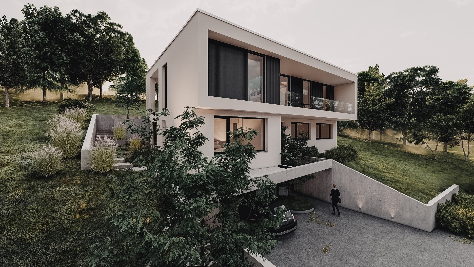 Haus H überzeugt mit seiner klaren, modernen Architektursprache, die Eleganz und Funktionalität auf harmonische Weise verbindet. Das kubische Design mit markanten Linien wird durch großzügige Glasflächen aufgelockert, die lichtdurchflutete Innenräume schaffen und den Blick in die grüne Umgebung öffnen. Der Wohnbereich im Obergeschoß öffnet sich zu einer ebenerdigen Terrasse, die fließend in den Garten übergeht. Hochwertige Materialien, ein klar strukturierter Grundriss und die Verbindung von Natur und moderner Architektur machen Haus H zu einem besonderen Wohnort.