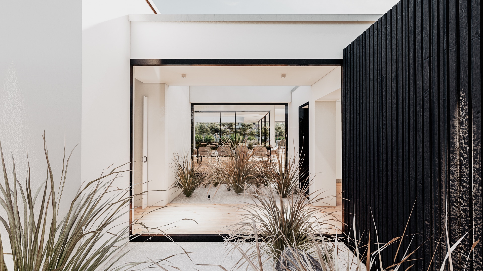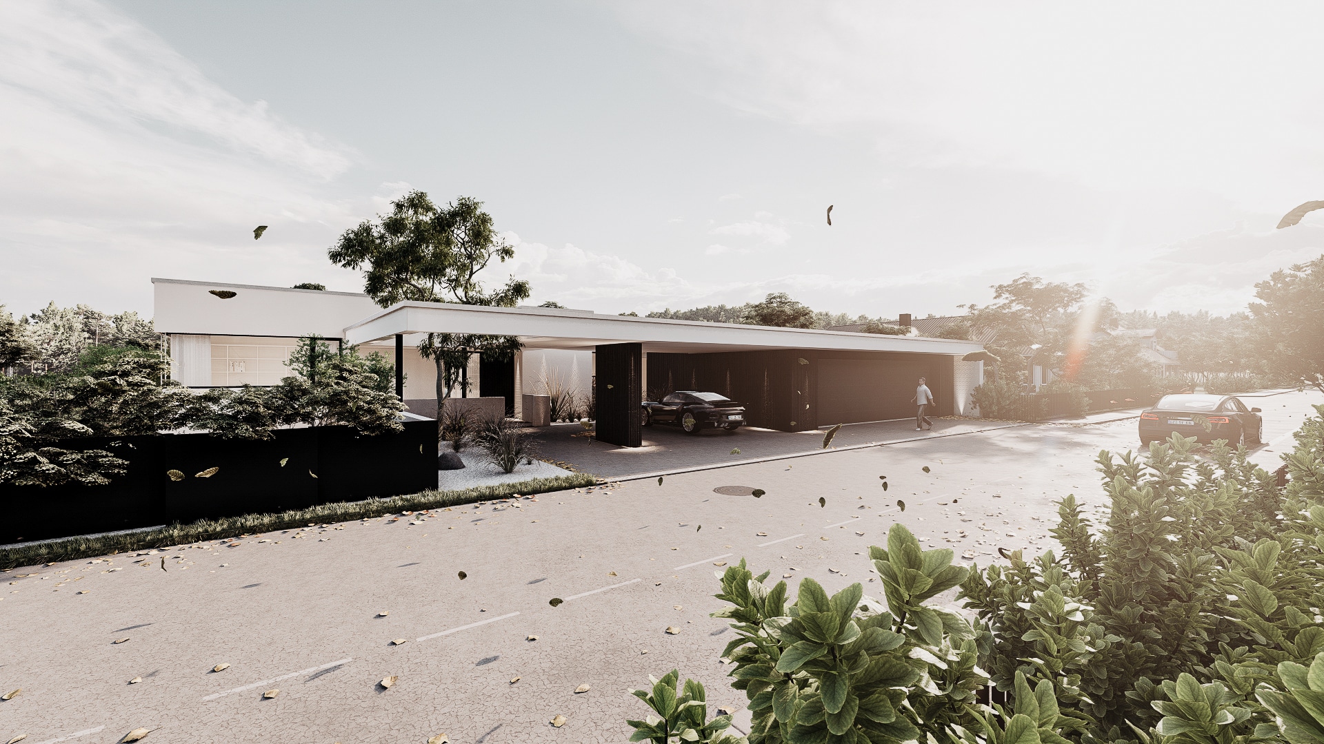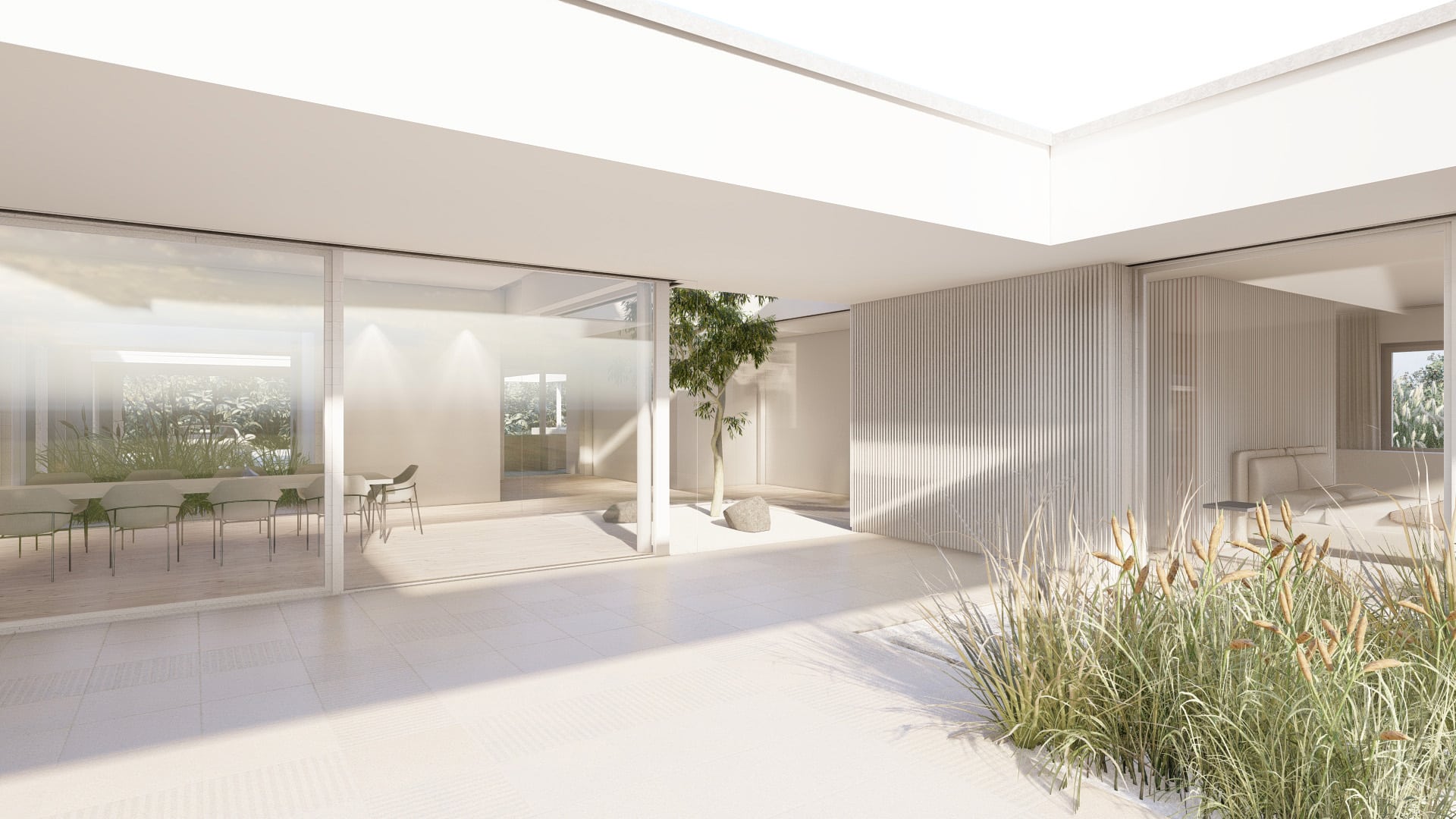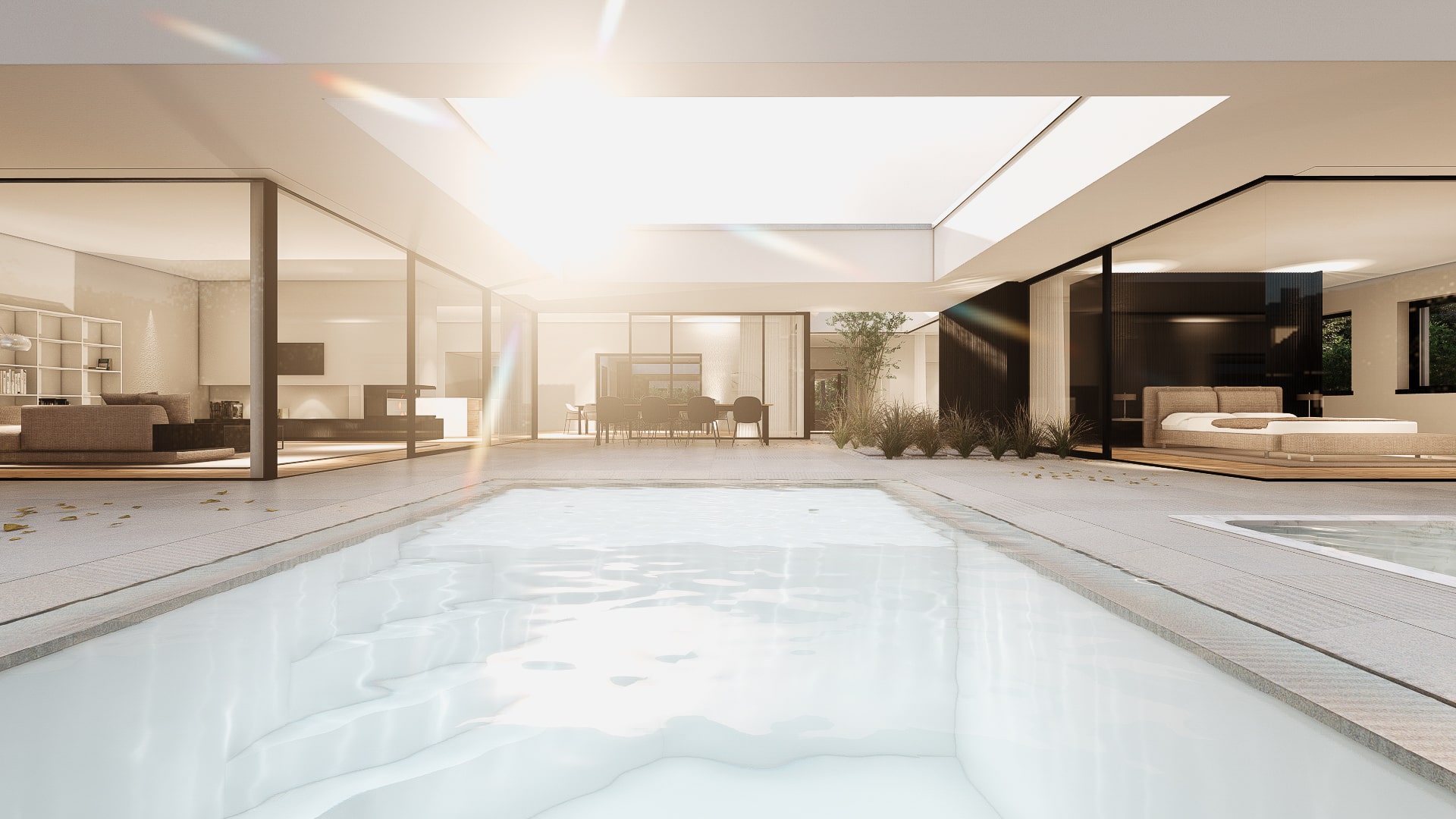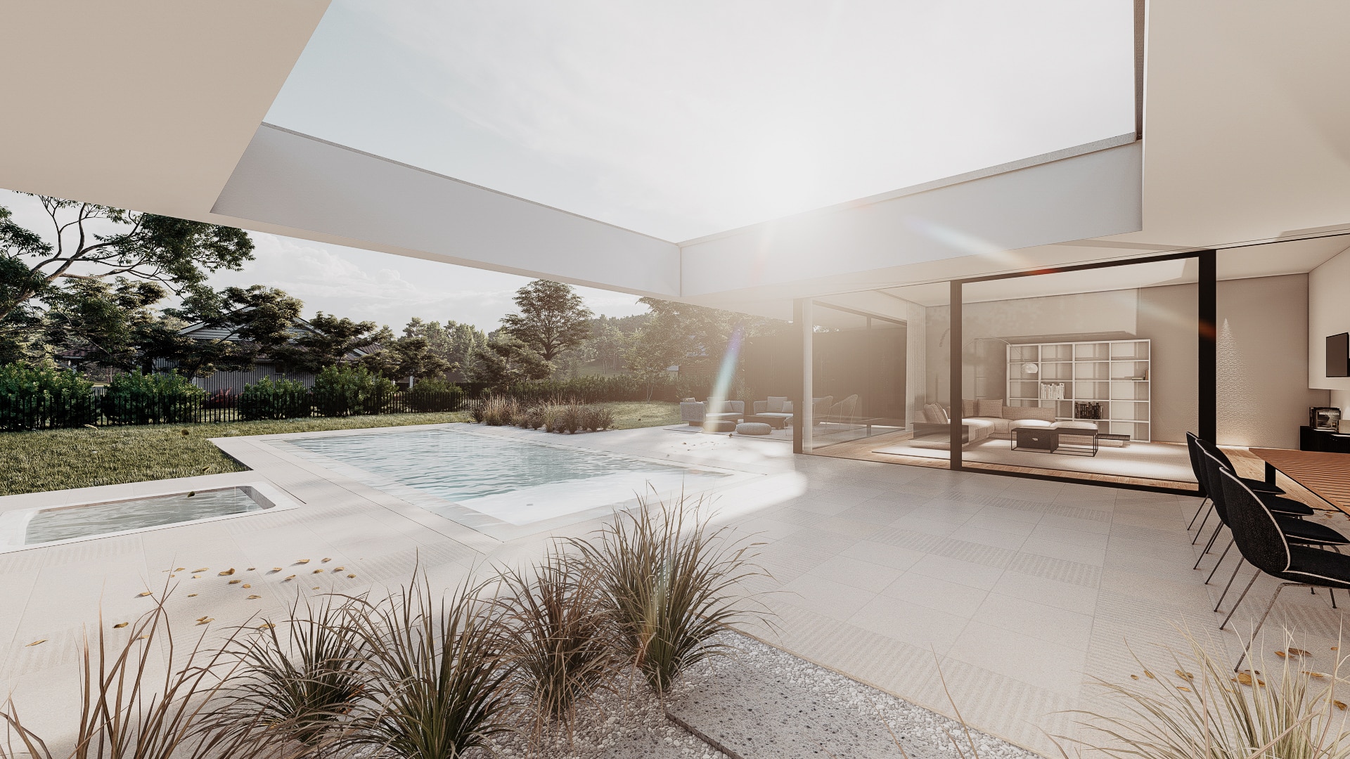 Der elegante Bungalow öffnet sich um einen lichtdurchfluteten Innenhof mit Pool und schafft so eine außergewöhnliche Verbindung von Innen- und Außenraum. Großflächige Verglasungen lassen die Grenzen zwischen Wohn-, Ess- und Entspannungsbereichen verschwimmen. Das Gebäude teilt sich in zwei Bereiche. Den privaten, zurückgezogenen Teil und jenen, in welchen mit Freunden und Familie gemeinsam gegessen und Zeit verbracht werden kann. Die Bereiche werden durch einen Innenhof von einander getrennt, bieten aber gleichzeitig spannende Blickbezüge und verbinden sich zu einer individuellen Einheit.