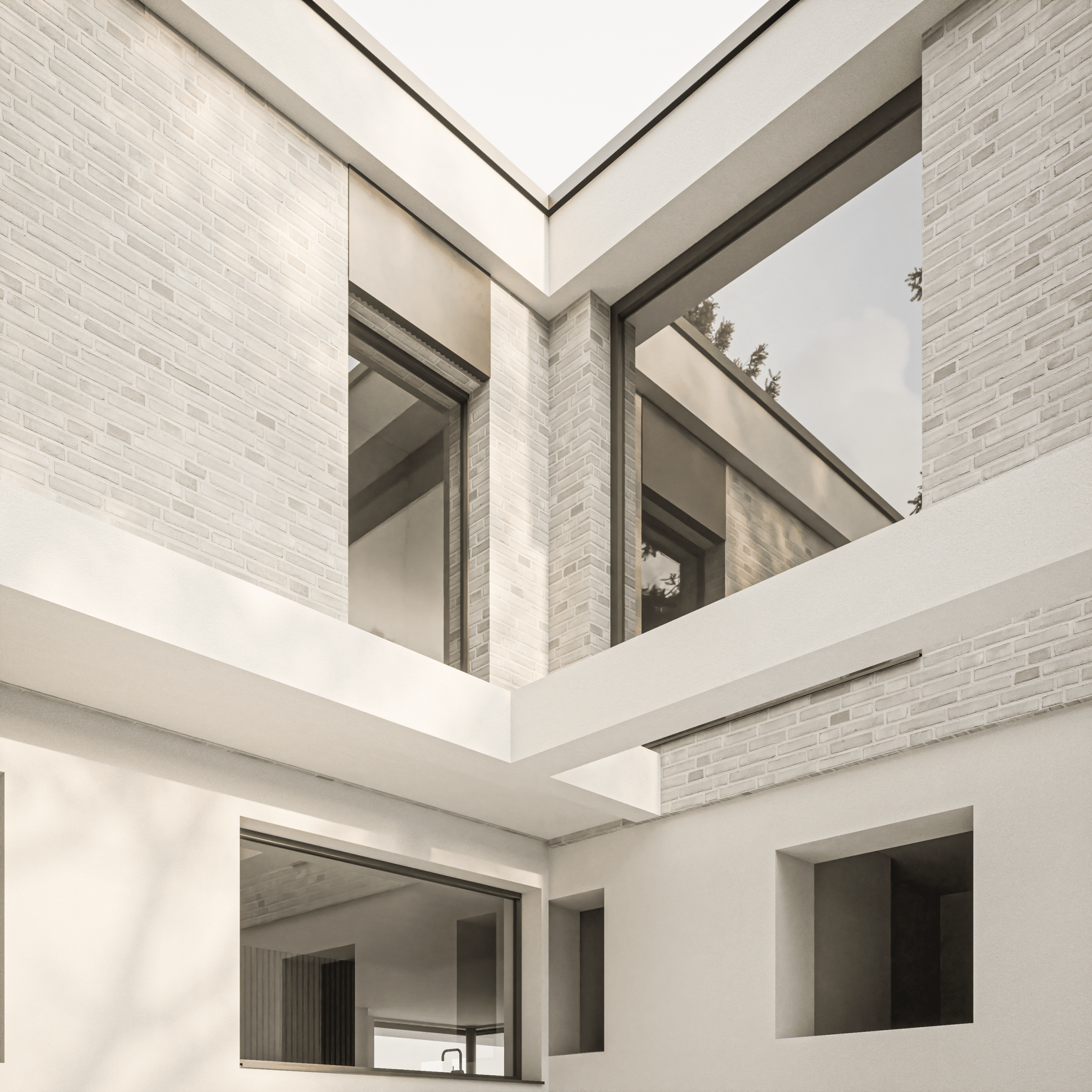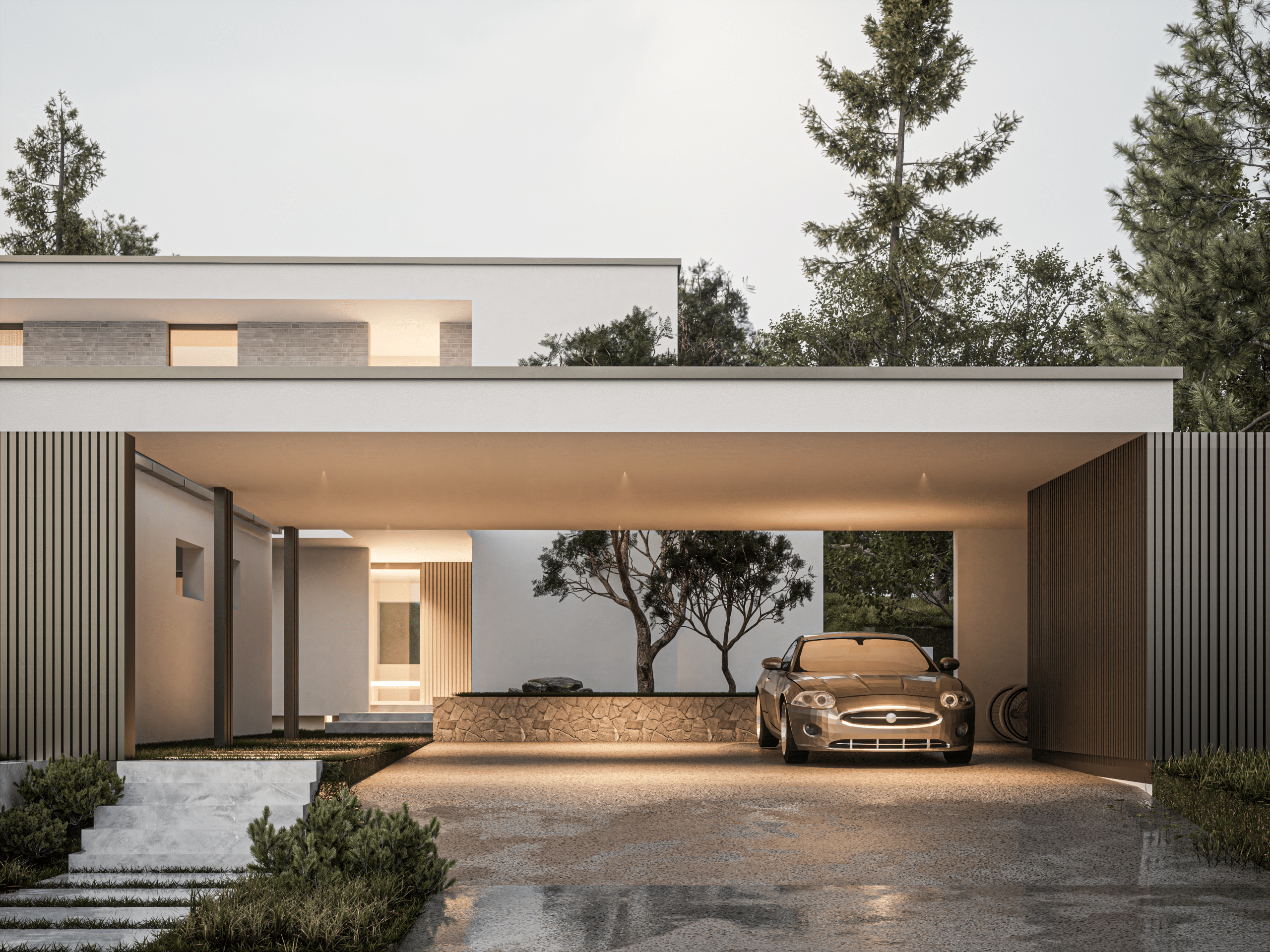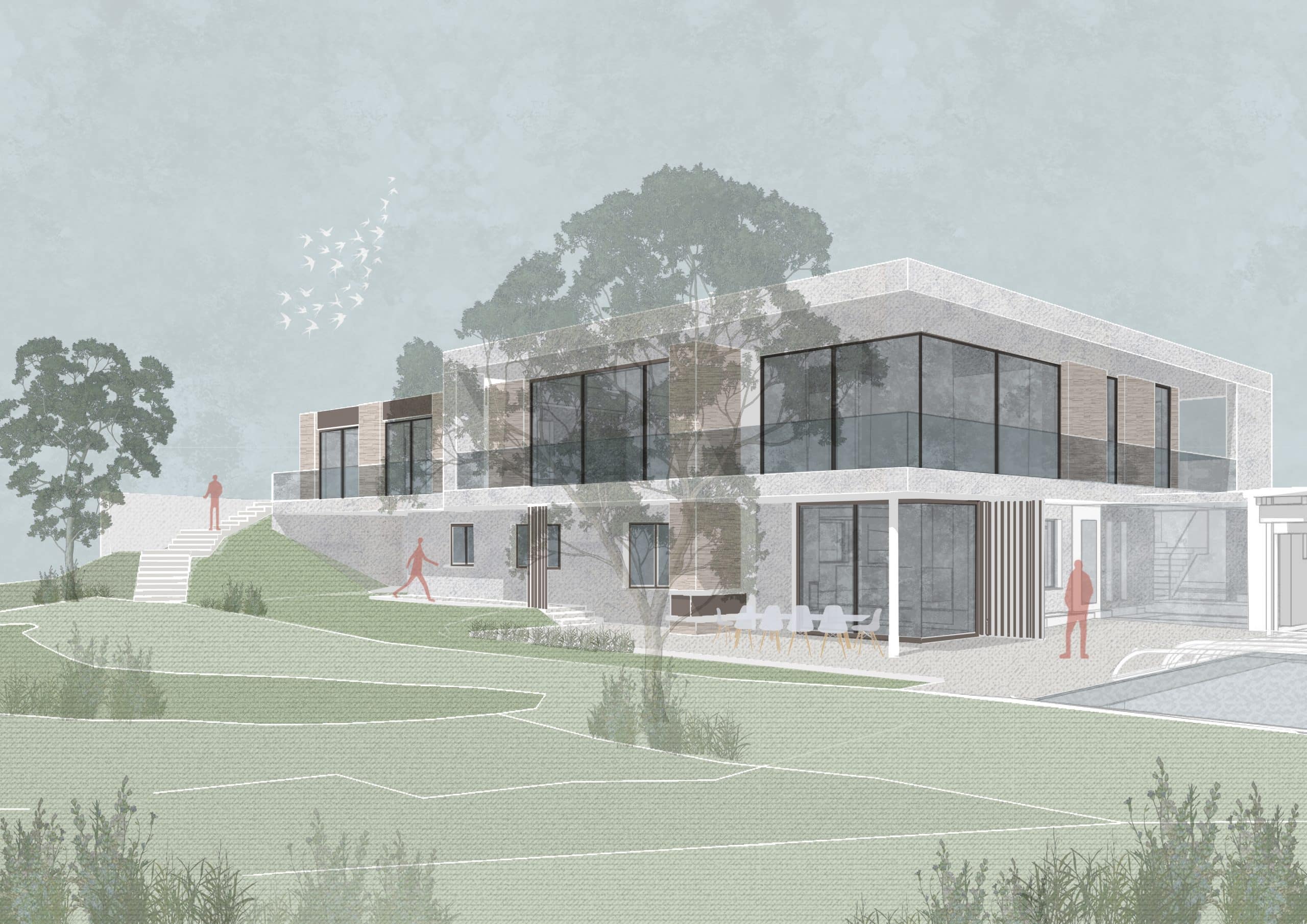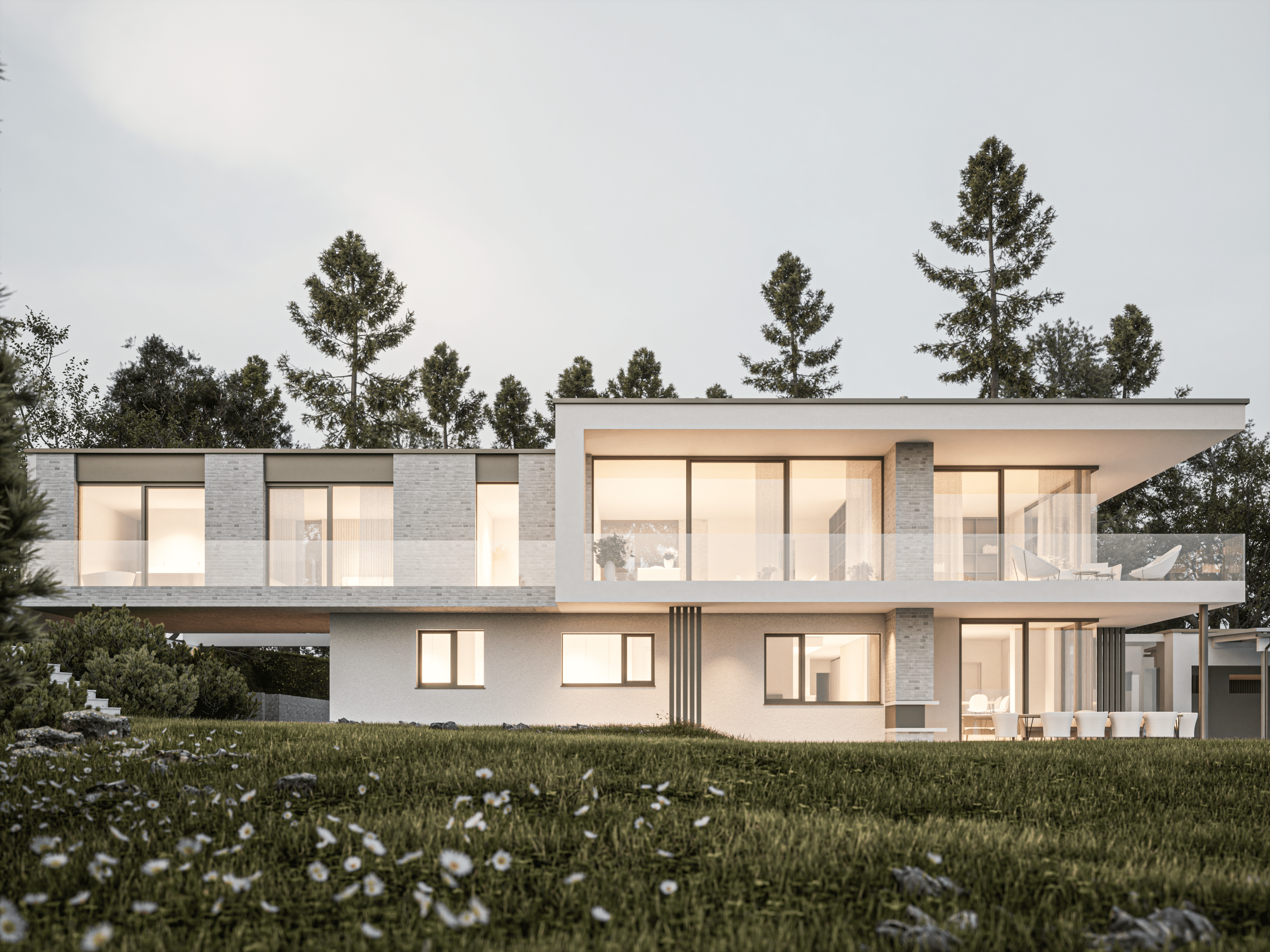 Der neue Entwurf präsentiert sich als modernes, zweigeschoßiges Wohnhaus mit klarer, zeitgemäßer Formensprache. Großzügige Glasflächen öffnen die Räume zur Natur und schaffen fließende Übergänge zwischen Innen- und Außenraum. Der langgestreckte Baukörper erhält durch horizontale Linien und gezielte Materialakzente eine klare Gliederung. Eine überdachte Terrasse sowie ein umlaufender Balkon erweitern den Wohnraum nach draußen. So entsteht eine Architektur, die Eleganz mit Funktionalität verbindet und sich zugleich harmonisch in die Landschaft einfügt.