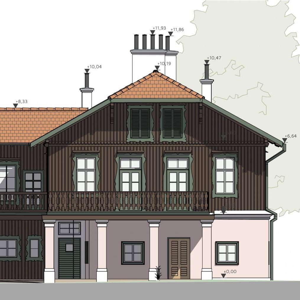 Dieses Bestandsgebäude wird derzeit als Einfamilienhaus genutzt. Der Wunsch der Bauherren war es, das Dachgeschoß auszubauen und ein Mehrgenerationenhaus zu schaffen, in dem zwei Familien eigenständig wohnen können. Grundlage dafür bildete eine präzise Bestandsaufnahme mit unserem 3D-Laserscanner, auf deren Basis das Gebäude dreidimensional nachmodelliert wurde.