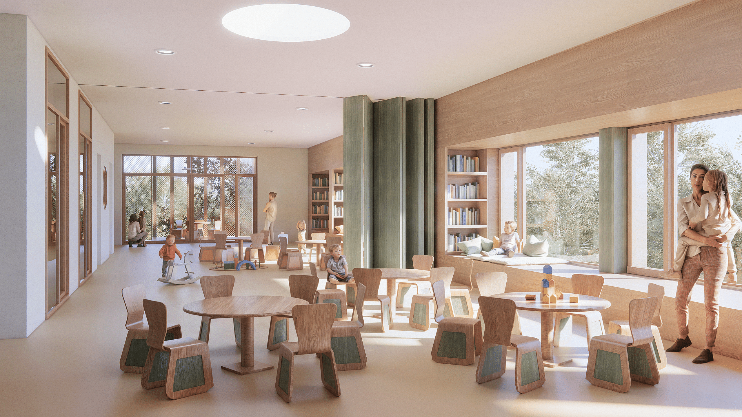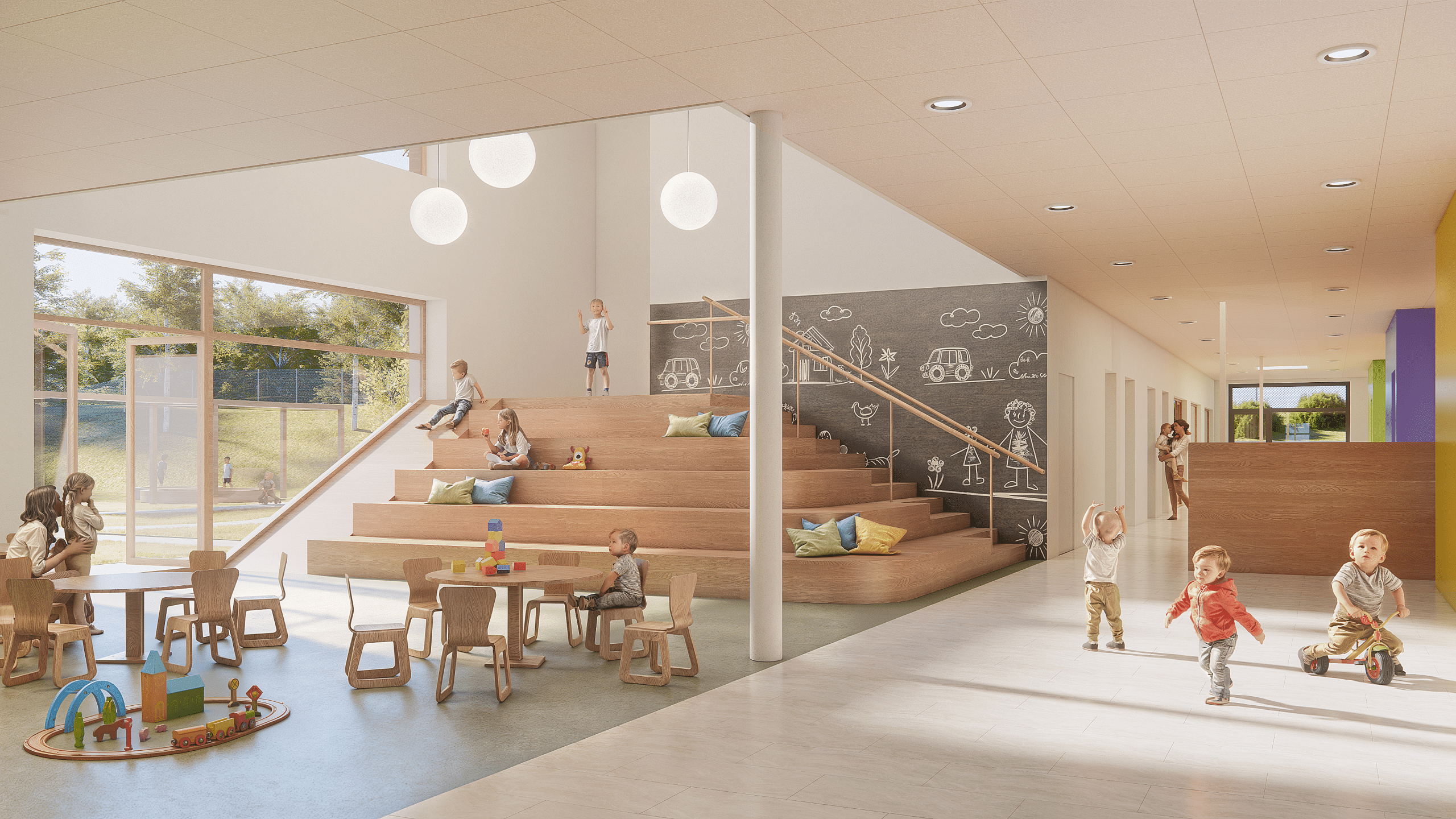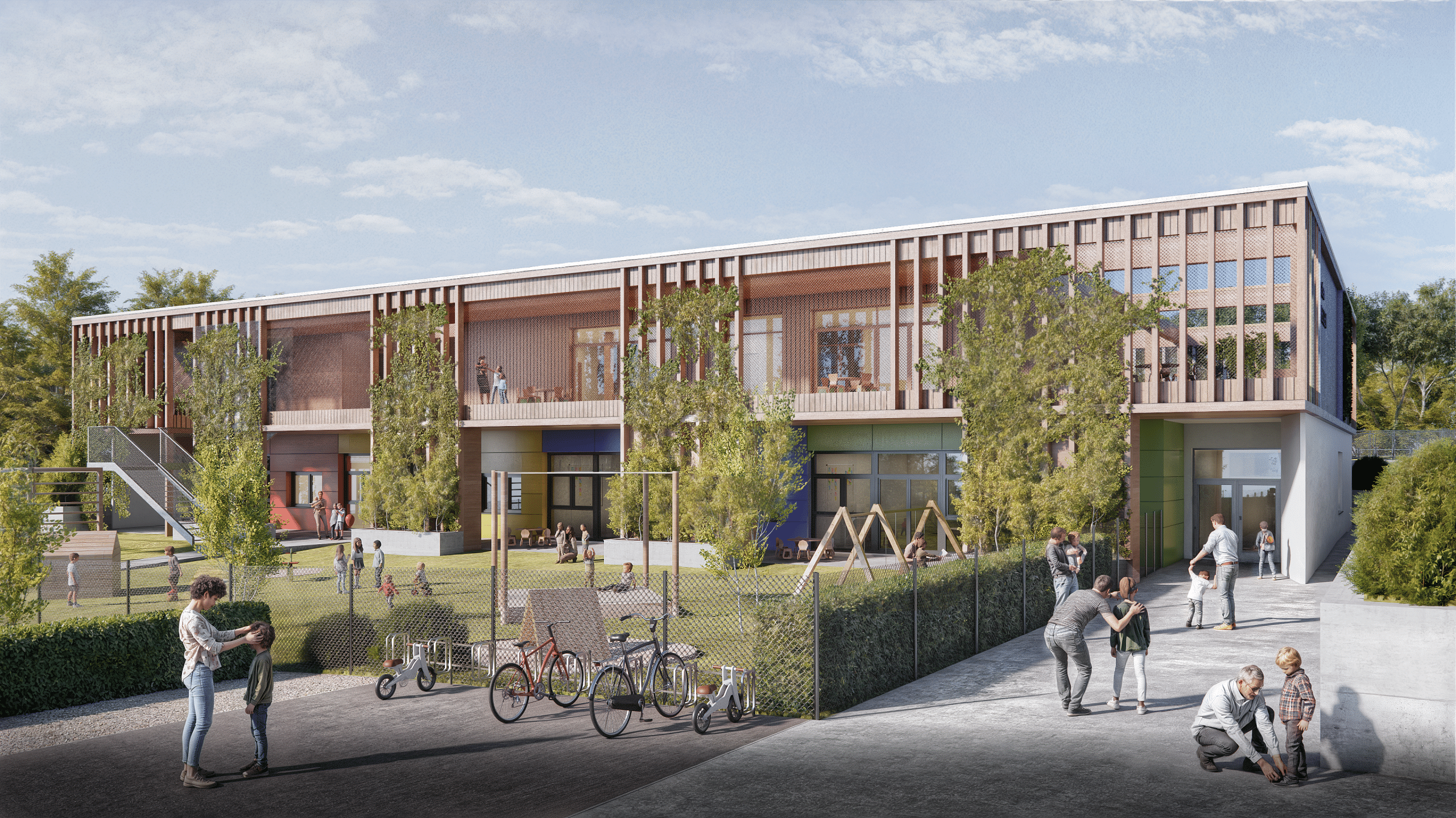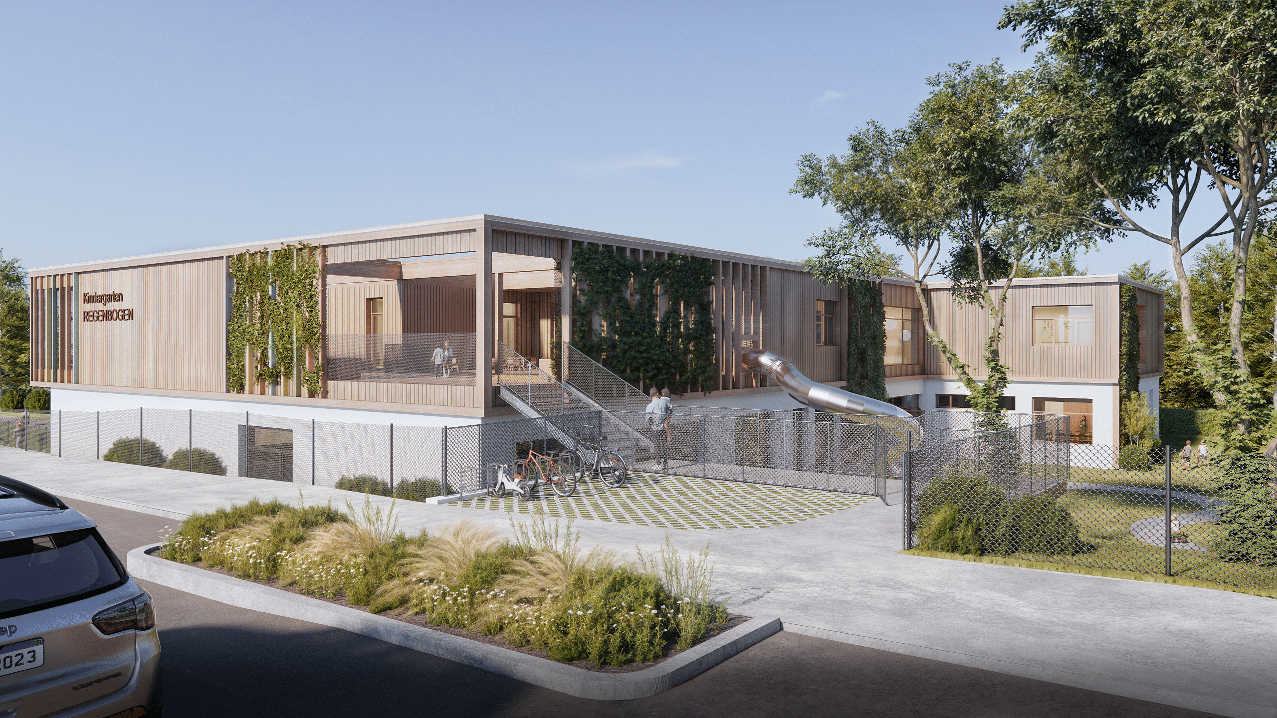Der Kindergarten LEO wurde mit dem Fokus auf eine inspirierende und kindgerechte Umgebung gestaltet. Helle, offene Räume, nachhaltige Materialien und flexible Lernbereiche schaffen eine Atmosphäre, die Kreativität und Entfaltung fördert. Die Architektur verbindet moderne Elemente mit naturnaher Gestaltung und sorgt so für ein harmonisches Zusammenspiel von Innen- und Außenräumen. Begrünte Fassaden, großzügige Spielflächen sowie ein durchdachtes Farb- und Materialkonzept machen den Kindergarten LEO zu einem idealen Ort für spielerisches Lernen und soziale Entwicklung.