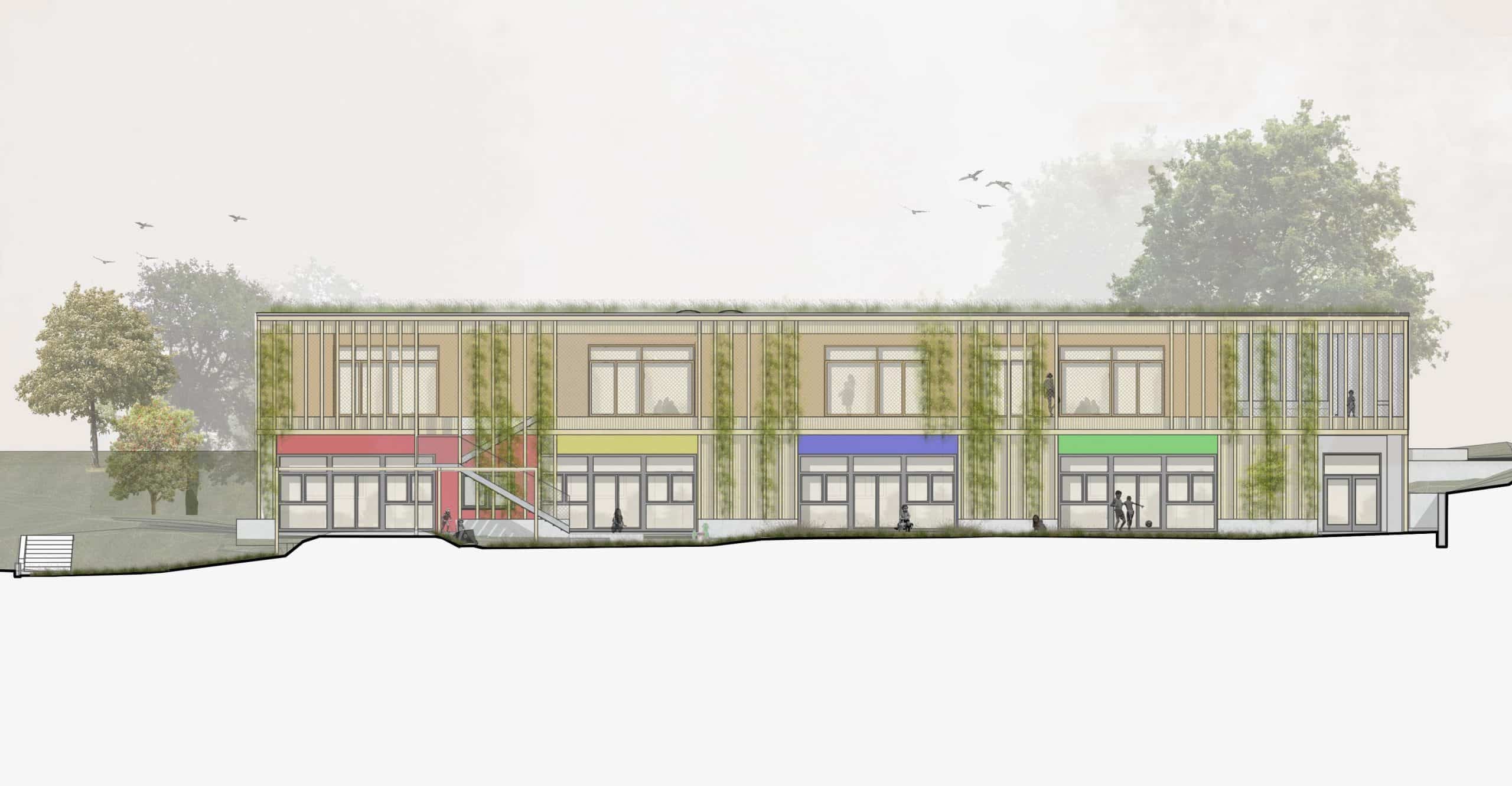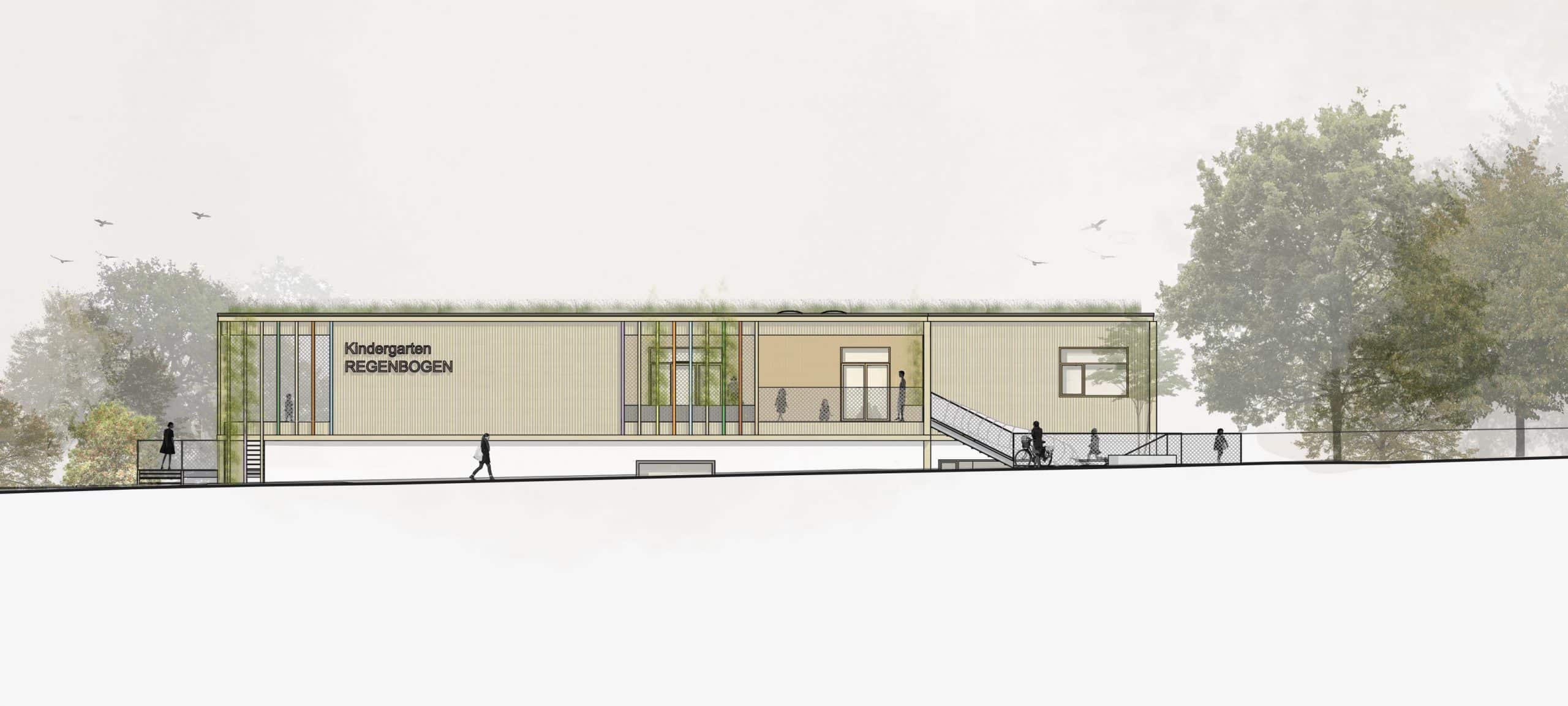 Bei diesem Wettbewerb konnte der 1. Platz erzielt werden. Ziel war die Erweiterung des bestehenden Kindergartens durch eine Aufstockung. Der neue Kubus schafft Raum für vier zusätzliche Kindergruppen und wird in Holzmassivbauweise errichtet. Kurze Wege zu den Freiflächen erleichtern den Kindern den Zugang ins Freie. Eine umlaufende Spielterrasse bietet nicht nur zusätzliche Aufenthalts- und Bewegungsflächen, sondern sorgt zugleich für die Verschattung der darunterliegenden Gruppenräume.
