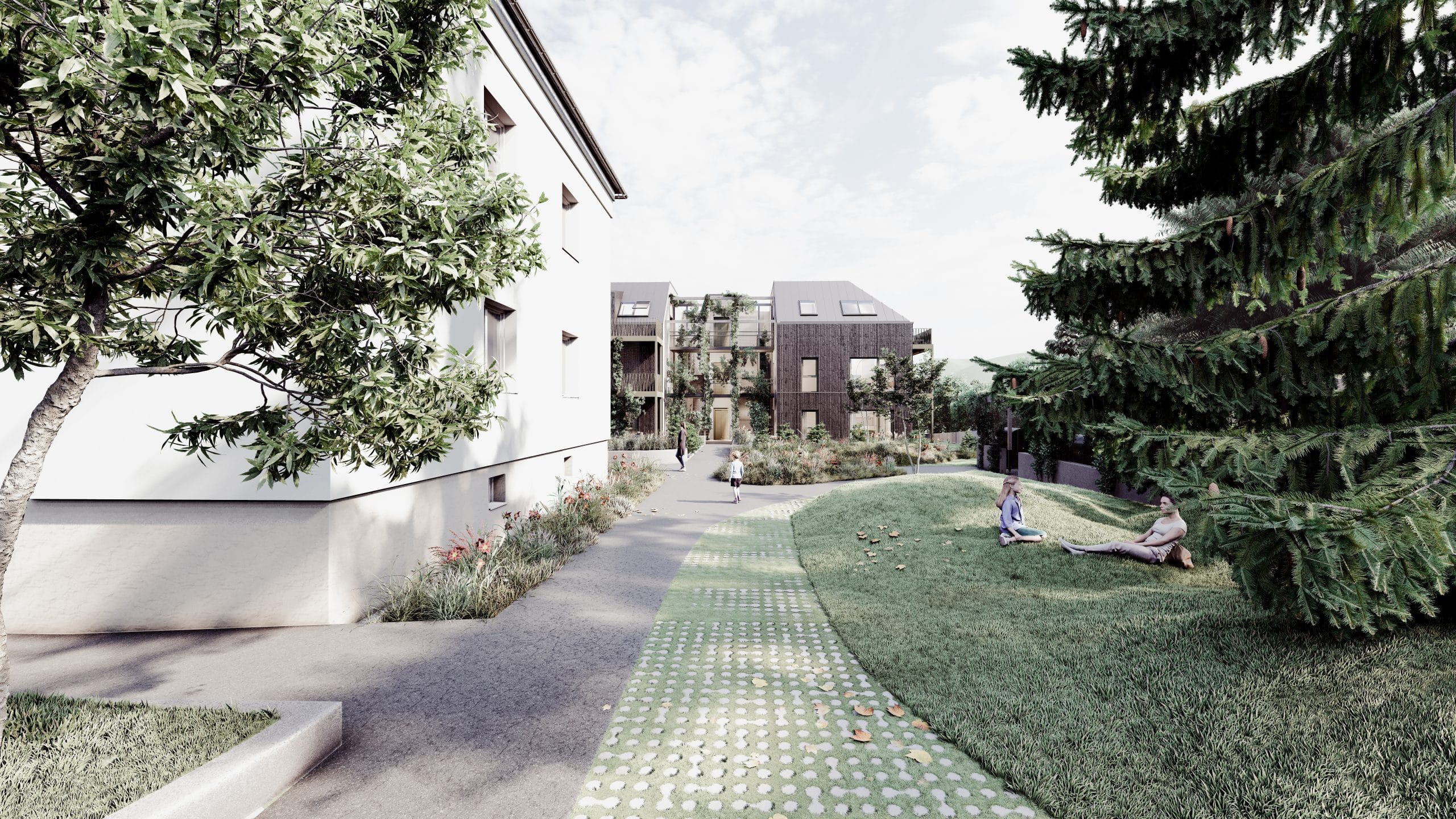 Großzügige Balkone sowie Photovoltaikanlagen auf begrünten Dächern tragen zur nachhaltigen Energiegewinnung und zum Wohlbefinden der Bewohner bei. Gemeinschaftszonen, Spielflächen und E-Mobilitätsangebote fördern das Miteinander und eine umweltfreundliche Lebensweise.