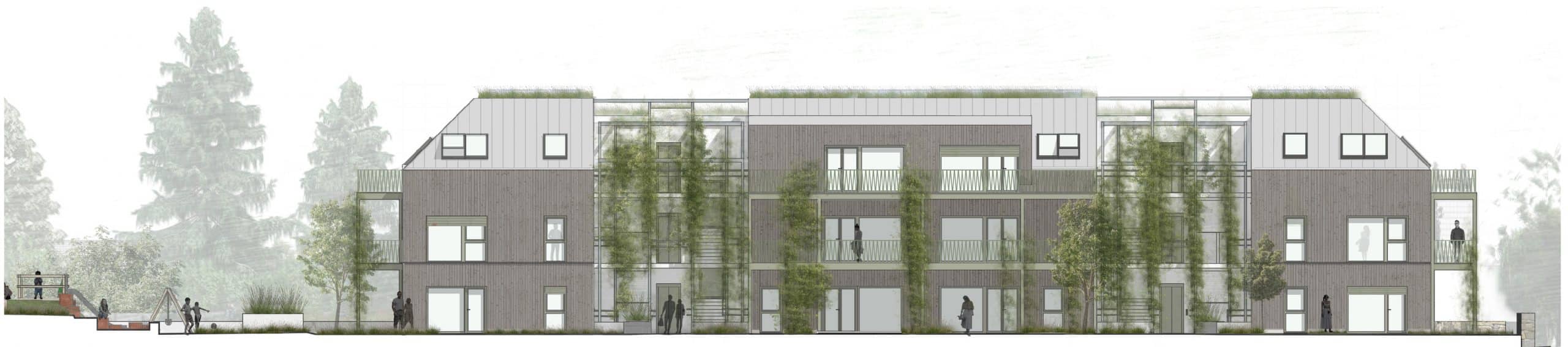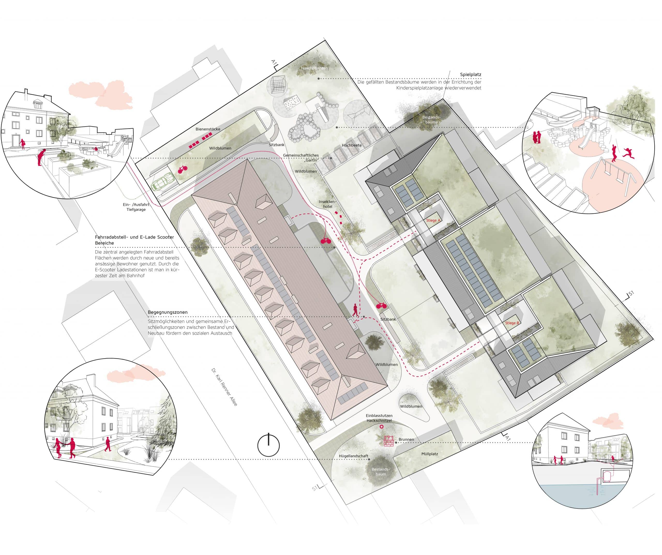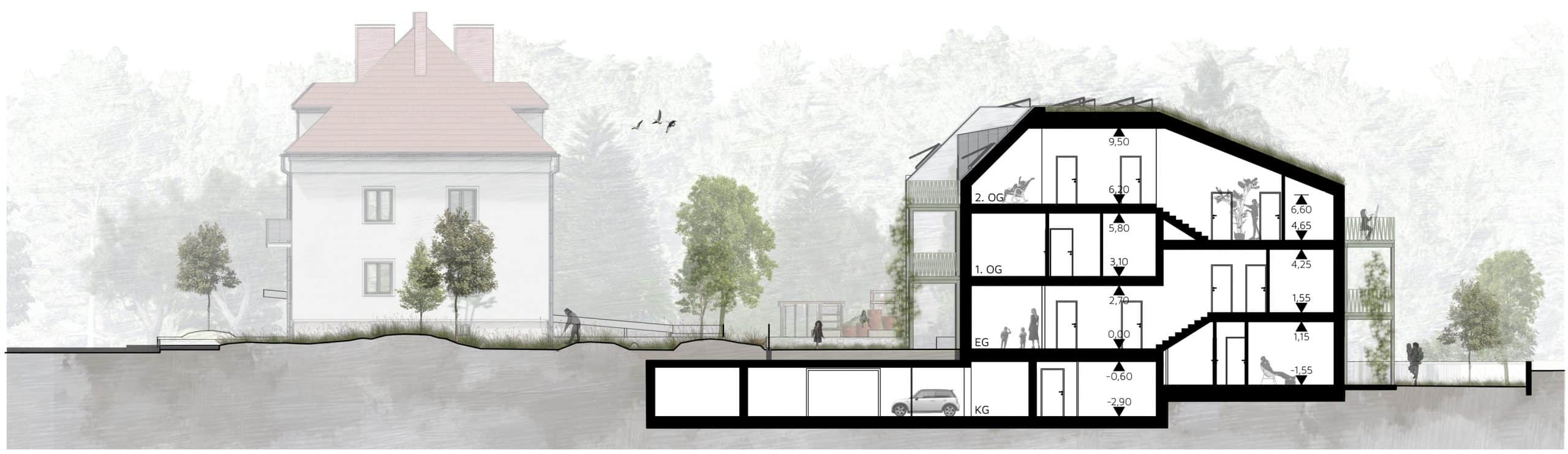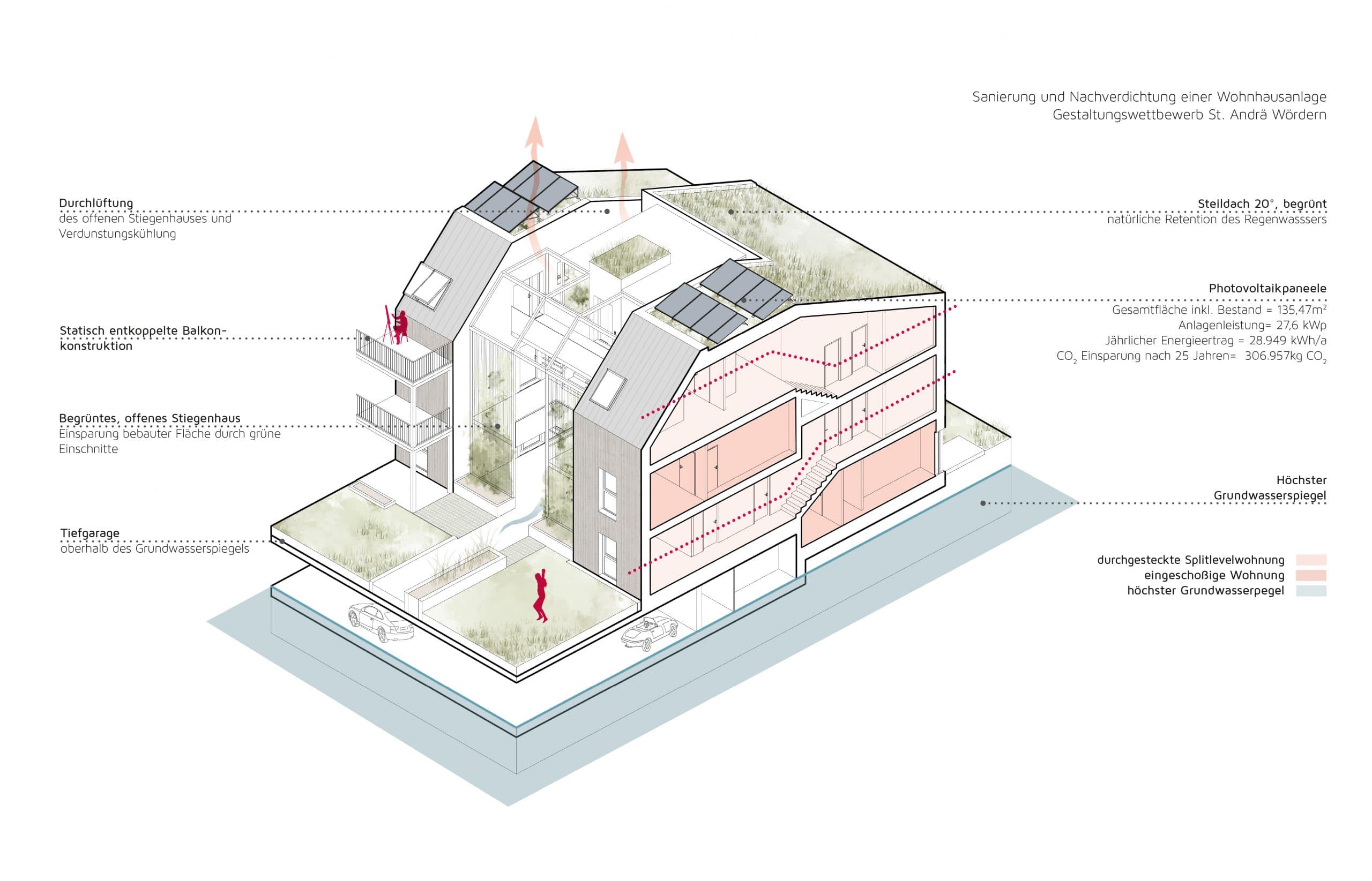 Der erhöhte Grundwasserpegel wurde als zentraler Planungsparameter aufgenommen, wodurch der Neubau in Splitbauweise konzipiert ist. Diese Lösung ermöglicht sowohl eine großzügige Tiefgarage als auch zusätzliche Wohneinheiten. Offene, begrünte Stiegenhäuser werden als nicht bebaute Flächen ausgeführt, was mehr Wohnnutzfläche schafft. Ihre leichte Stahlkonstruktion mit Begrünung sorgt zudem für ein angenehmes Mikroklima.